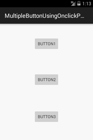 -------------------package com.anil.android.multiplebuttonusingonclickproperties; import android.support.v7.app.AppCompatActivity; import android.os.Bundle; import android.view.Menu; import android.view.MenuItem; import android.view.View; import android.widget.Toast; public class MainActivity extends AppCompatActivity { @Override protected void onCreate(Bundle savedInstanceState) { super.onCreate(savedInstanceState); setContentView(R.layout.activity_main); } //calling the method names public void show1(View v){Toast.makeText(getApplicationContext(),"Button1 is Working",5000).show(); } public void show2(View v){Toast.makeText(getApplicationContext(),"Button2 is Working",5000).show(); }public void show3(View v){ Toast.makeText(getApplicationContext(),"Button3 is Working",5000).show(); } }